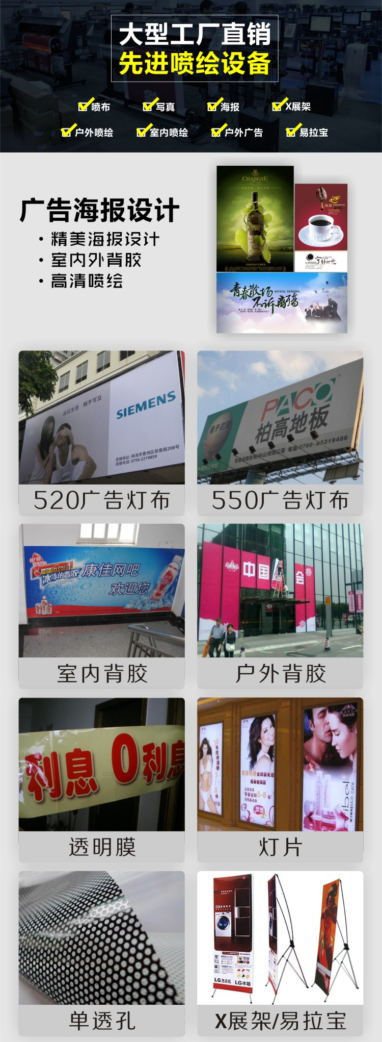 噴繪、寫真、PP背膠、燈箱片、油畫、單透、招牌幕布、海報、相紙